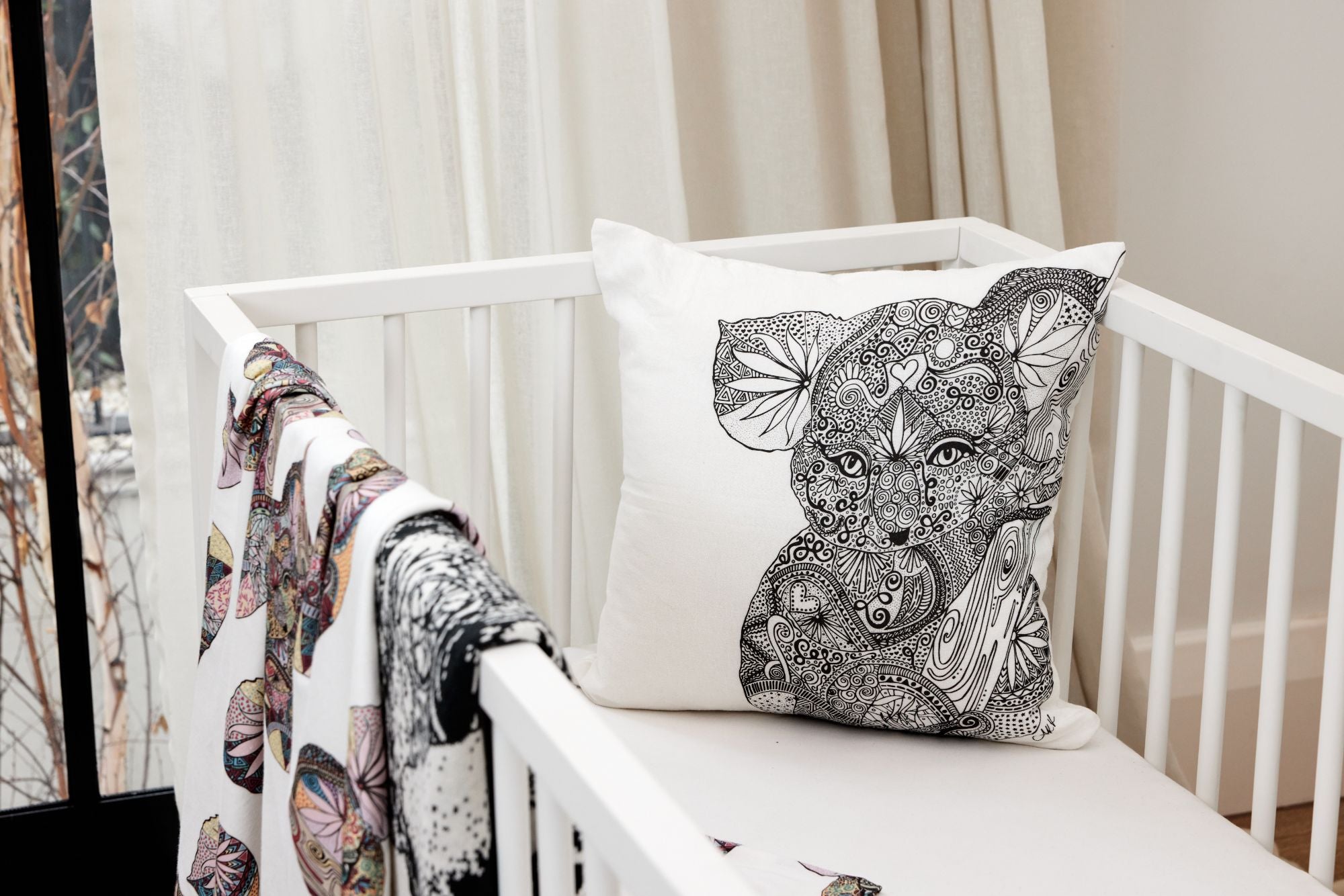 Create a unique nursery space with the Kimberly the Koala print range. Begin with a bassinet sheet, then layer pillows and blankets. Add a koala print to the wall. Then select from a beautifully soft jersey wrap or delicate muslin wrap for your little one.